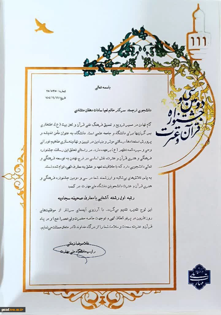 امتیاز دهید : کسب رتبه اول کشوری دانشجوی آموزشکده ملی مهارت دختران میبد در سی و دومین جشنواره سراسری فرهنگی و هنری قرآن وعترت 2 یکشنبه 23 شهریور 1404 ساعت 10:11